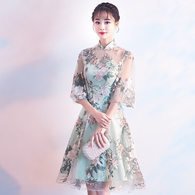 3色 フラワー刺繍 3色 チュールレース パーティードレス チャイナカラー ワンピース 通販 パーティードレス